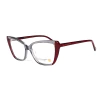 Este modelo em destaque tem acabamento na cor bordô nas laterais, destacando um leve gateado em contraste com o cinza fumê transparente da armação.