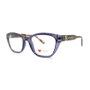 Armação feminina retangular da marca Milano Vizzano tamanho 52. Cores predominantes: óculos com azul escuro transparente na frontal, marrom tartaruga sólido nas hastes e detalhes dourados na temporal.