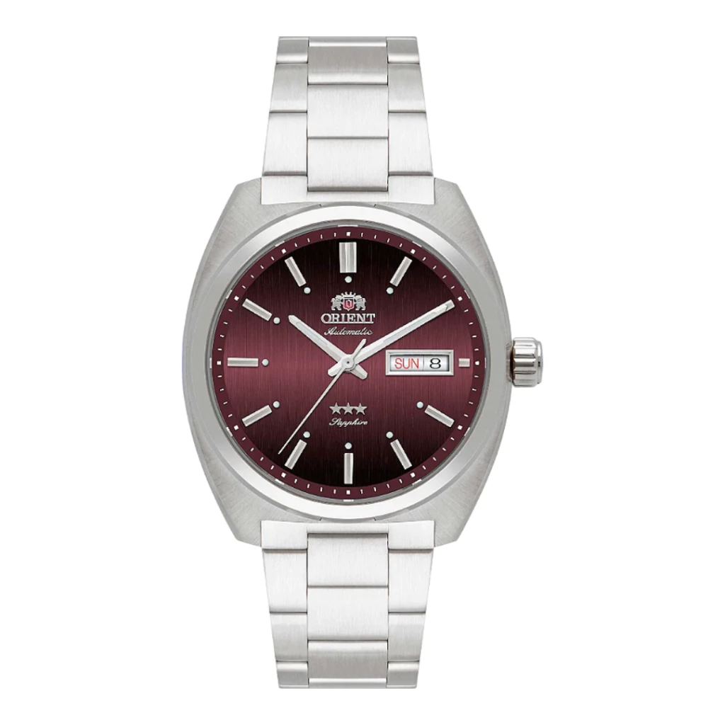 Relógio automático Orient da linha Heritage. Com marcante mostrador cor cereja / burgundy. O polimento brilho destaca a beleza da caixa que combina polimentos em aço prata fosco para detalhes mais sóbrios. Ideal para quem aprecia a tradição da Orient e busca um relógio sofisticado para uso mais casual.