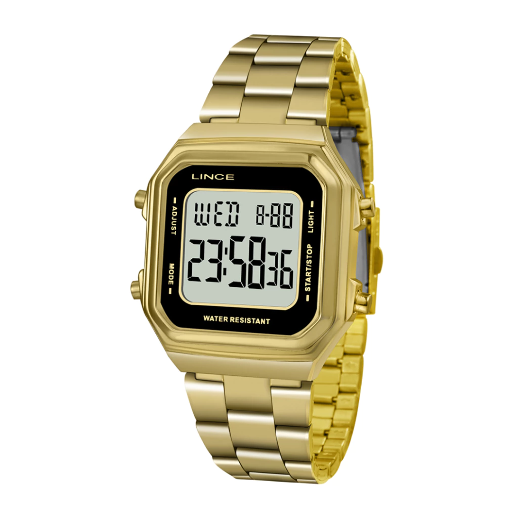 Relógio Lince de metal tamanho médio com calendário, ideal para o dia a dia. Este é um relógio de pulso feminino digital dourado e pulseira com fecho dobrável.