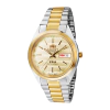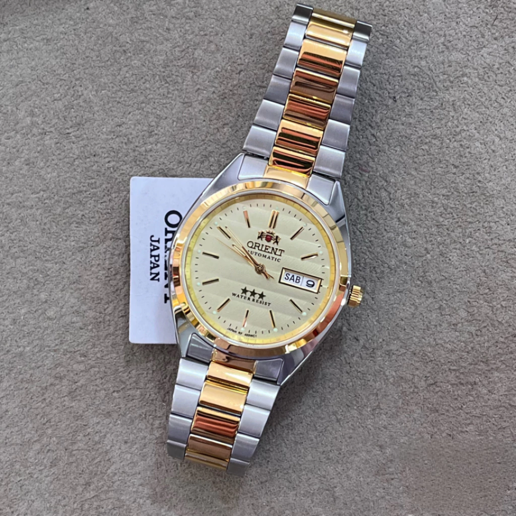 Orient três estrelas clássico com mostrador dourado, pulseira mista bicolor com diferentes polimentos em dourado e prateado. Peça toda em aço inoxidável prateado. Relógio sofisticado, de tamanho mais contido (aproximadamente 38 mm).