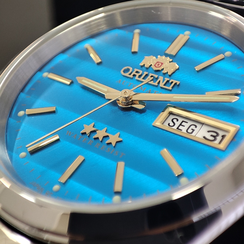 Relógio de pulso Orient três estrelas, o clássico absoluto agora disponível em prateado com o mostrador azul. Modelo todo em aço inoxidável e com resistência à água de 50 metros!