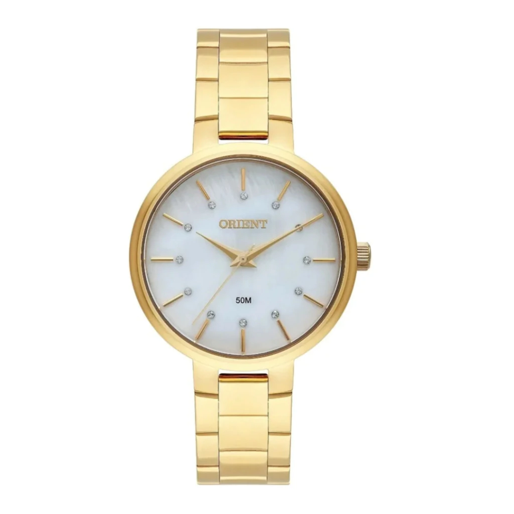 Procurando um relógio de pulso de aço, opção de acessório feminino para presente de dia das mães ou dia dos namorados? Este Orient dourado com indicadores de hora com cristais e mostrador madrepérola com certeza será uma opção maravilhosa!