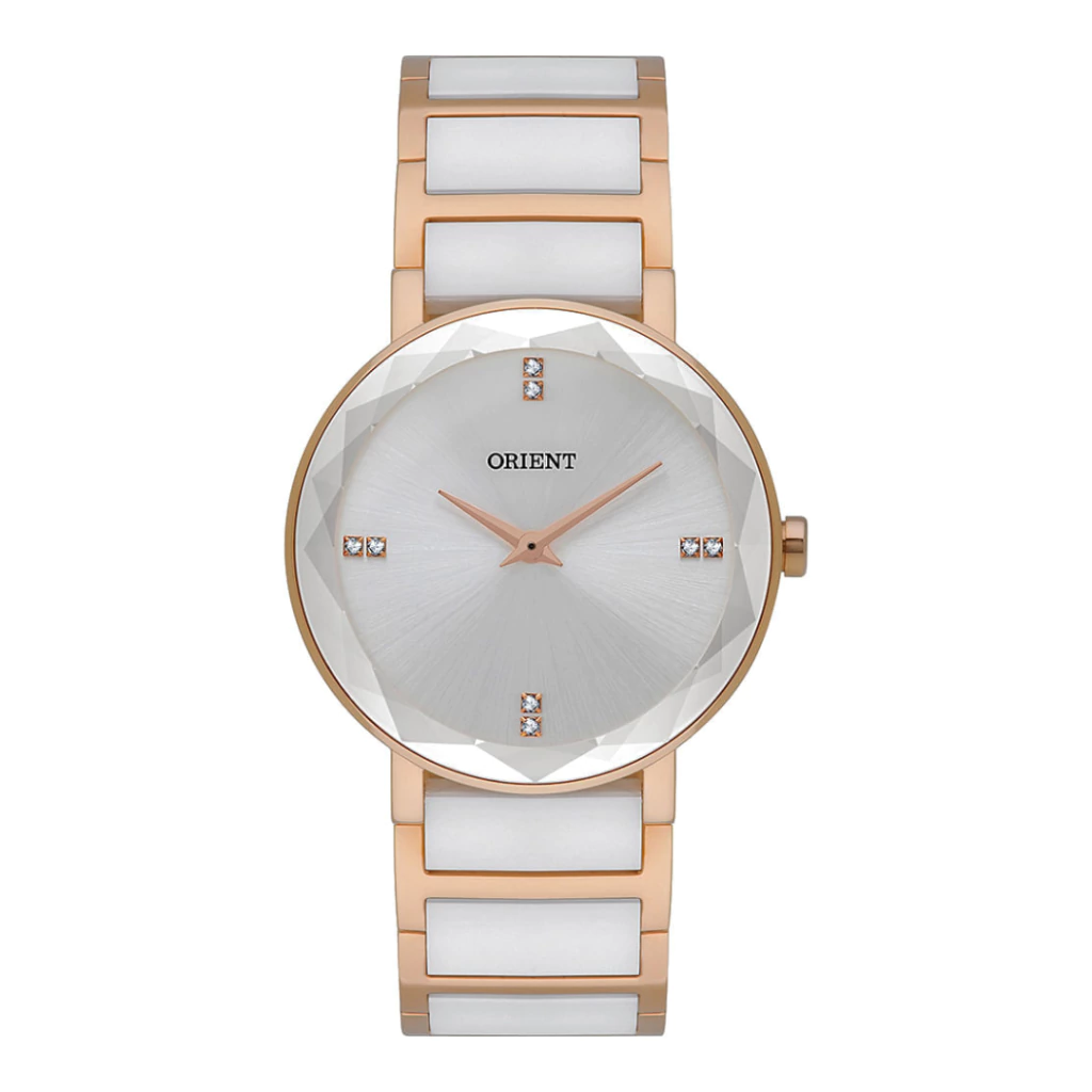 Descubra o relógio de pulso com acabamento em cerâmica, escolha ideal para mulheres que valorizam a elegância e a funcionalidade em seus acessórios. Relógio de pulso feminino minimalista, com fundo branco perolado, pulseira branca de cerâmica e acabamento rosé gold.