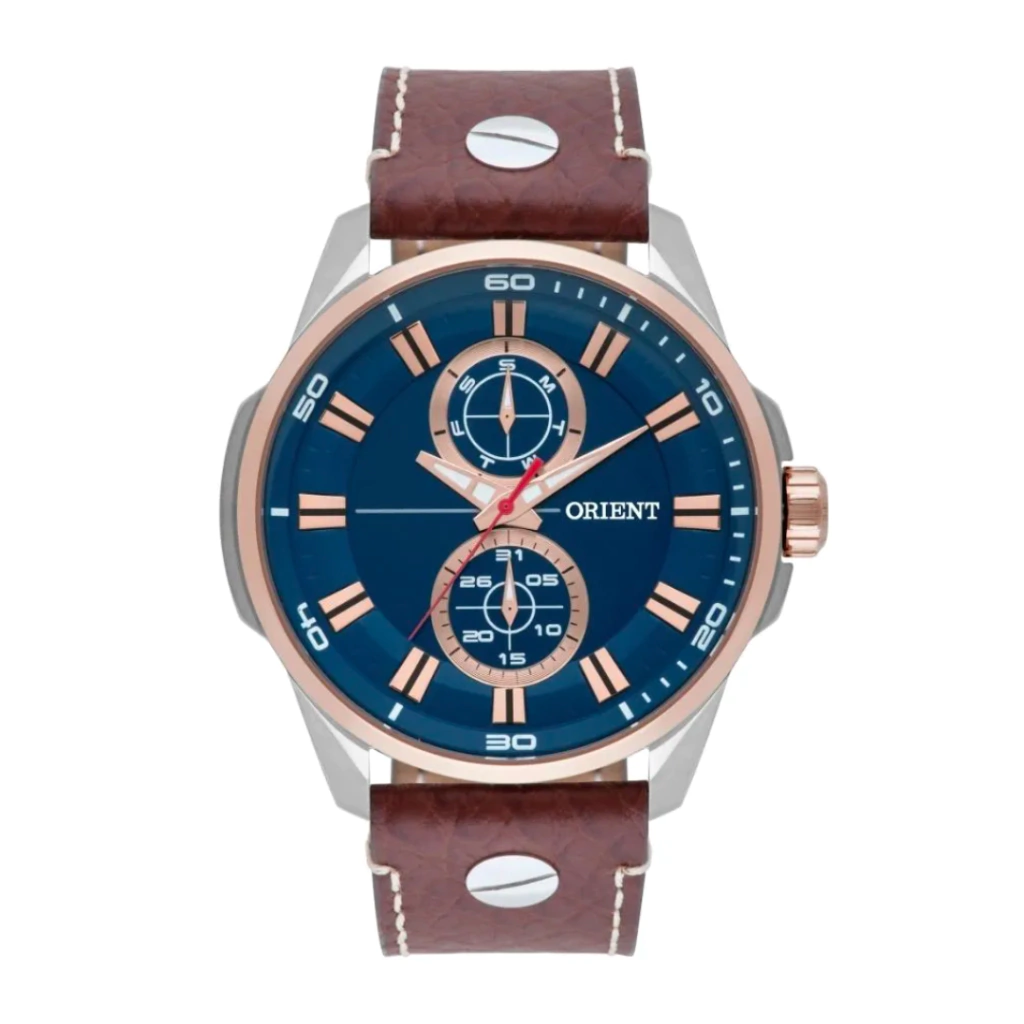 Este Orient com acabamento em aço polido marrom e mostrador azul com certeza será uma grande escolha!