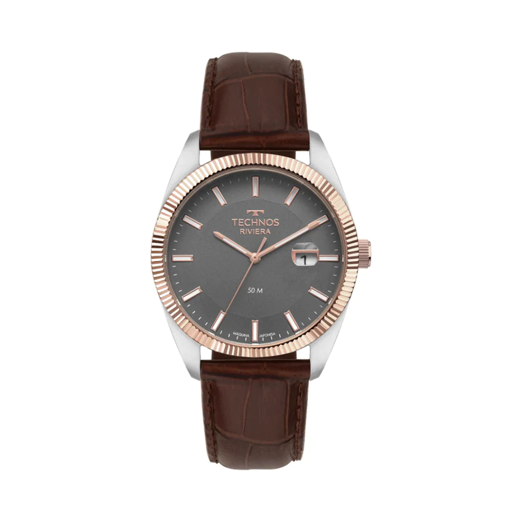 O Relógio Technos Riviera é a escolha ideal para quem busca elegância e durabilidade. Destaque para o aro externo corrugado em ouro rosado que confere um toque mais sofisticado. A pulseira de couro legítimo marrom garante conforto e estilo, combinando perfeitamente com o caixa em aço inoxidável de alta qualidade.